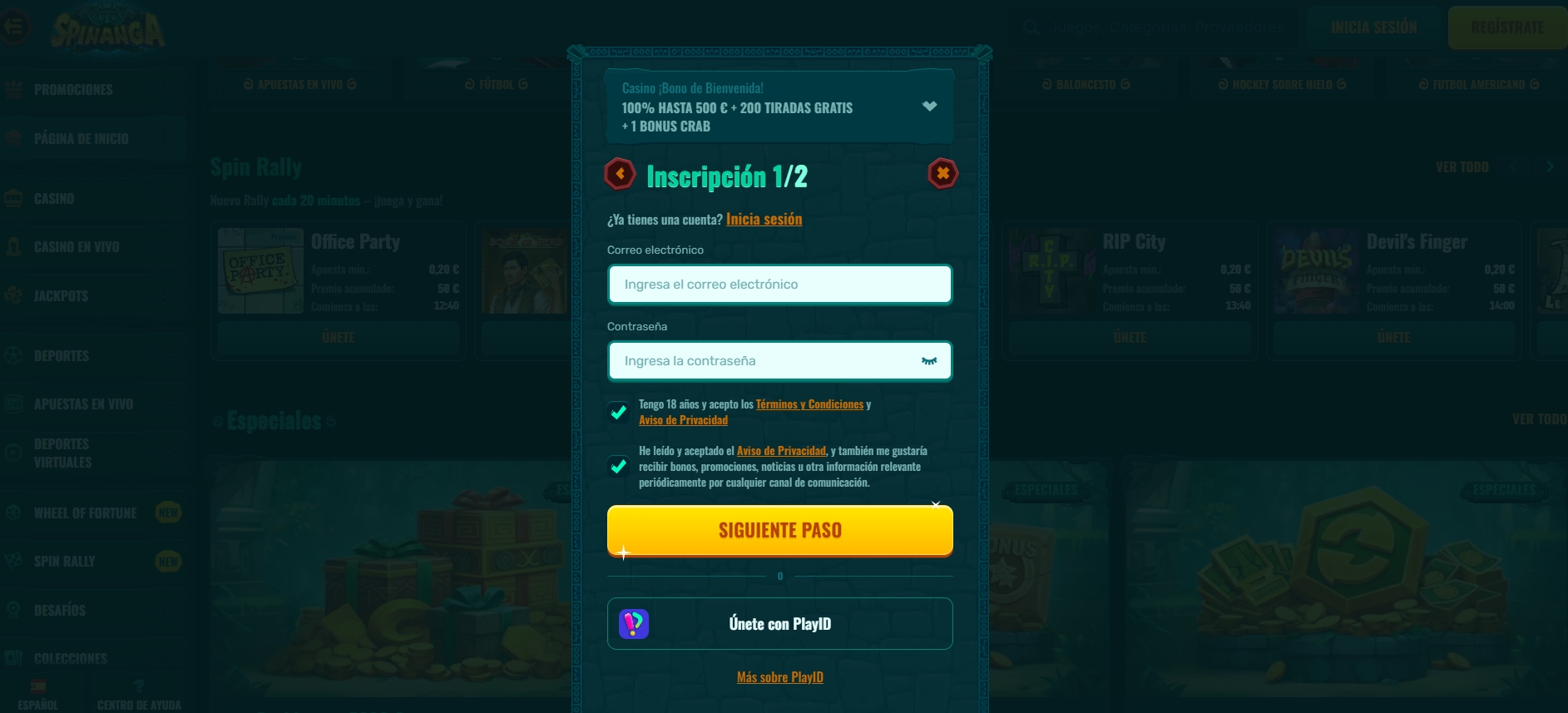 5. Crear credenciales – El jugador debe definir un correo válido y una contraseña segura para su Spinanga login.